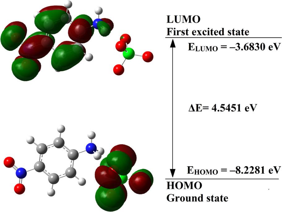 Frontier molecular orbital pictures and energies for p-nitroanilinium perchlorate obtained at B3LYP/6-311++G(d,p).