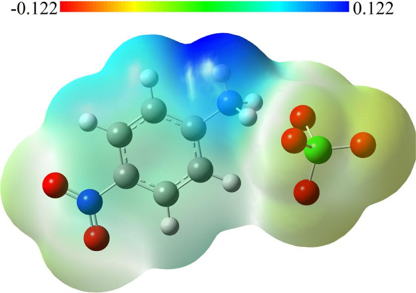 3D plot of molecular electrostatic potential (MEP) surface for p-nitroanilinium perchlorate obtained at B3LYP/6-311++G(d,p).