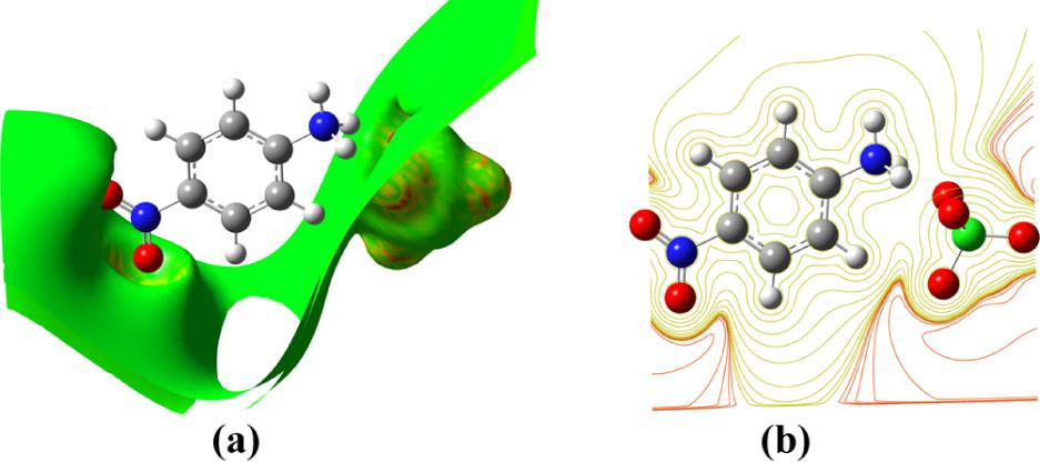 As can be seen from the MEP surface of PNAPC, while the regions having the most negative potential are over the perchlorate group, oxygen and chloride atoms with a maximum value of −0.122 a.u., the regions having the most positive potential are over the hydrogen atoms of ammonia group with a maximum value of +0.122 a.u. So, the MEP clearly indicates the formation of the intermolecular hydrogen bonding interactions. In Fig. 5, the negative MEP is also localized over nitrogen and oxygen atoms of the nitro group and is reflected as a yellowish color, while the positive MEP is localized over the ring of hydrogen atoms and is reflected as bluish. This is an expected behavior, since electrostatic potential correlates with electronegativity and partial charges. The electrostatic surface potential (ESP) and the contour plot of ESP were simulated by using B3LYP/6311++G(d,p) level. The polarization effect is also visible in these illustrations as can be seen in Fig. 6.