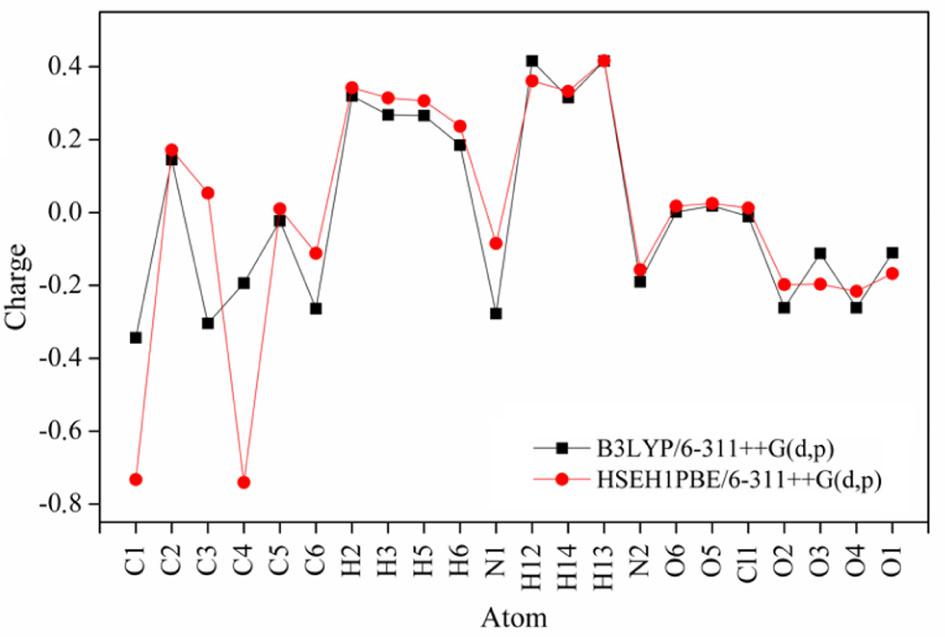 Mulliken atomic charges calculated at the B3LYP and HSEH1PBE levels with the 6-311++G (d, p) are collected in Fig. 7. The maximum negative charge belongs to O2 and O3 atoms and its value is −0.541. The maximum positive charge belonging to Cl atom is 1.128. The atomic charges of all hydrogen atoms in the NH3 group are positive. The atomic charges of two hydrogen atoms involved in the hydrogen bonding interaction are 0.323, while the third is 0.266. So, the H atoms involved in the hydrogen bonding interactions have higher positive charge than the third one. These charge variations clearly reveal the existence of N–H···O intermolecular hydrogen bonding. The electron withdrawing character of NO2 group in PNAPC is demonstrated by the decrease of electron density on ring carbon atom. The N1 atom has negative charge, while the N2 atom has positive charge due to the electronegativity of oxygen atoms. From Fig. 7, the carbon atoms have either positive or negative charges between −0.054 and 0.128, while all of the ring hydrogen atoms have positive charge.