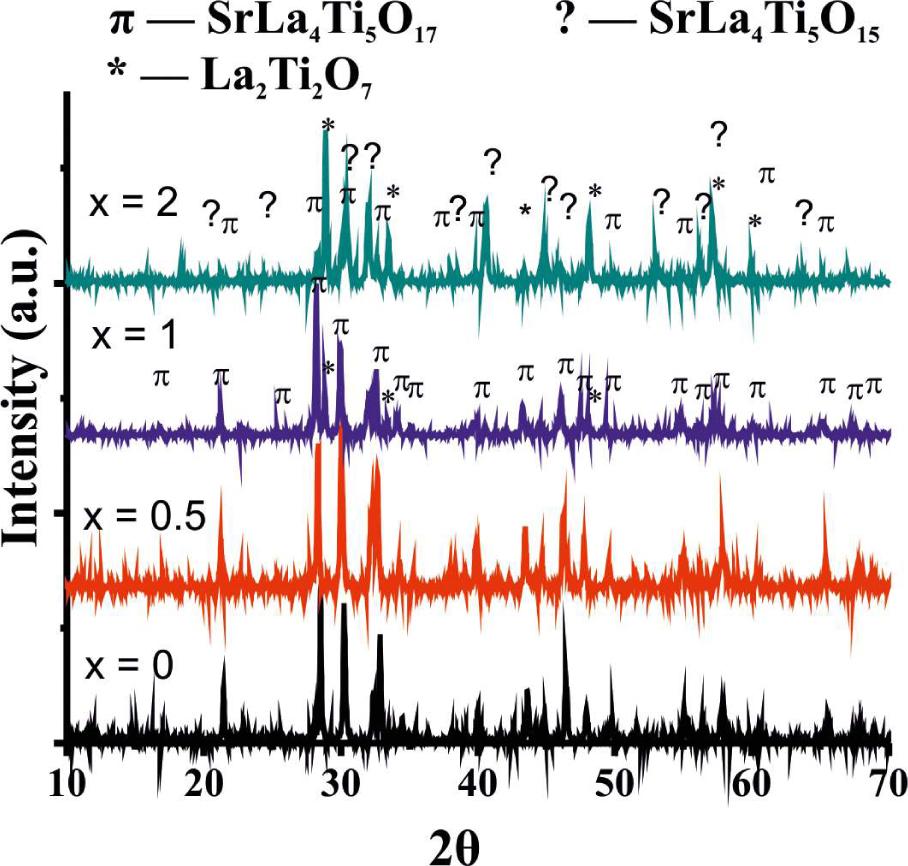 XRD patterns of SrLa4Ti5−xSnxO17 (0 ≤ x ≤ 2) ceramics, showing the formation of SrLa4Ti5O17, SrLa4Ti4.5Sn0.5O17 at x = 0 and 0.5, SrLa4Ti4Sn1O17 along with La2Ti2O7 at x = 1 and La2Ti2O7 and SrLa4Ti4O15 along with a few diminishing peaks due to SrLa4Ti4SnO17 at x = 2.