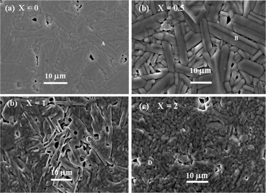 The secondary electron images (SEIs) of thermally etched and gold-coated surfaces of SrLa4Ti5−xSnxO17 (0 ≤ x ≤ 2) ceramics sintered at their optimum sintering temperatures are shown in Fig. 2. The microstructure of the compositions with x = 0, and 0.5 comprised of elongated grains of the size ranging from 1 × 1 μm2 to 5 × 7 μm2 and 1 × 3 μm2 to 5 × 20 μm2 (Fig. 2a and Fig. 2b). Semi-quantitative SEM EDS (Table 1) of the grains labeled as “A” and “B” indicated that the composition of these grains was close to SrLa4Ti5O17 and SrLa4Ti4.5Sn0.5O17, respectively. Generally, the microstructure of the composition with x = 1 also comprised of elongated rod and plate-shaped grains labeled as “c” (Fig. 2c), where the molar elemental composition of these grains was close to SrLa4Ti4SnO17 (Table 1). The microstructure of the composition with x = 2 comprised of micro-regions including cubical grains labeled as “D” (Fig. 2d). Semi-quantitative EDS (Table 1) indicated that the composition of these grains was close to La2Ti2O7 phase as the EDS detected little Sr or Sn in these grains. This suggested the presence of grains due to La2Ti2O7 phase as observed by XRD of the same composition. The observed variation in the composition of the grains (Table 1) combined with the morphological change from rod-shaped grains to cubical grains with an increase in Sn content indicated the formation of secondary phases.