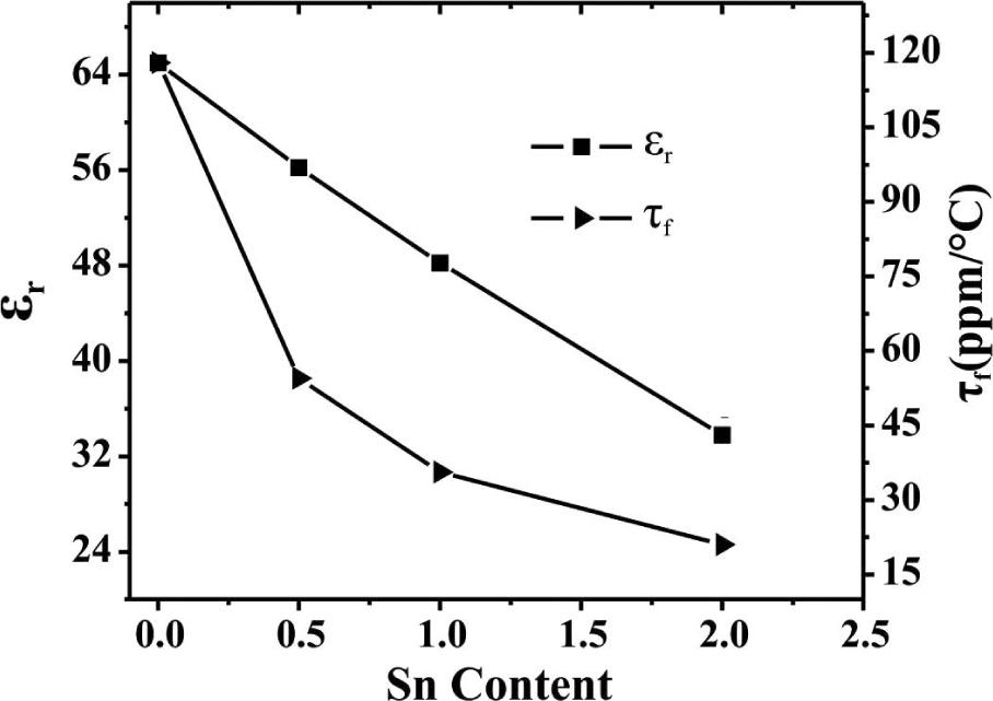 Variation in εr and τf versus Sn4+ content (x) for SrLa4Ti5−xSnxO17 (0 ≤ x ≤ 2) compositions sintered at their optimum sintering temperatures.