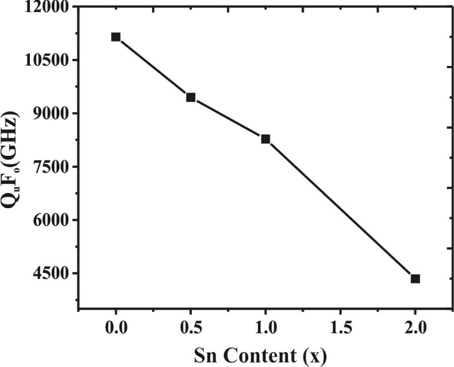 Variation in Qufo versus Sn4+ content (x) for SrLa4Ti5−xSnxO17 (0 ≤ x ≤ 2) compositions sintered at their optimum sintering temperatures.