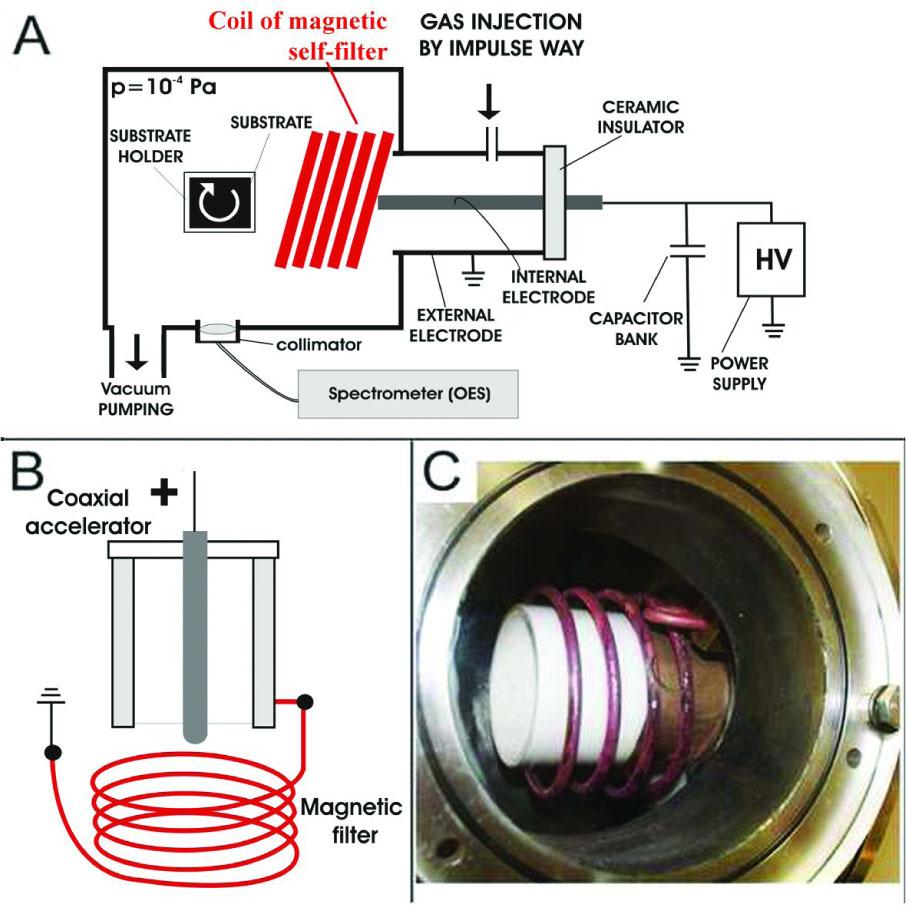 The scheme of the apparatus used in the experiment is presented in Fig. 1A. Impulse plasma is generated in the accelerator which consists of coaxially arranged electrodes made of aluminum (99.5 % purity). Nitrogen was used as a working gas, individual doses of which were injected by impulse valve into the interelectrode space of the accelerator. The impulse plasma is initiated between the electrodes of the accelerator as a result of high current discharge of 2 mF capacitors with 1 kV voltage. After that, the plasma is accelerated by Ampere force towards the accelerator outlet in a form of paraboloidal plasmoid. The electrodes material is continuously eroded, and the products of erosion enrich the plasma as synthesis reactants. A precise characterization of the IPD method has been described in the literature [22, 23]. Fig. 1B shows the wiring diagram of the magnetic filter. Fig. 1C presents a photograph of the filter installed in the vacuum chamber. The filter is made of a bent copper bar in a form of a coil which is connected with an electric circuit of accelerator in series. As presented in the diagram, during the first half of the discharge waveform, the internal electrode gets a positive bias. The electric current flows through the plasma in the direction of external electrode, and then along the turns of the coil, and thus generates the magnetic field whose induction vector is directed along the z-axis of accelerator.