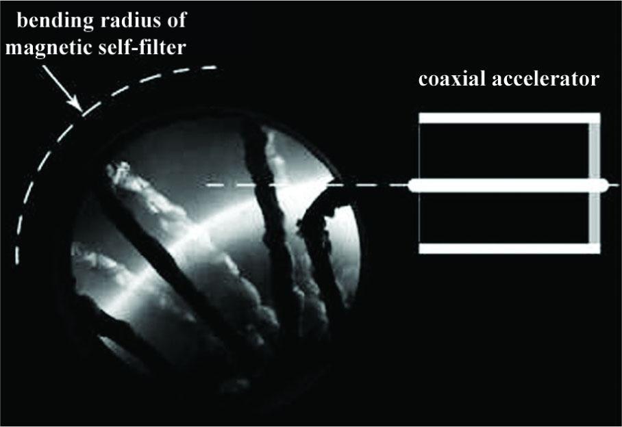 Fig. 2 shows a photograph of a single shot of the plasma accelerator taken at a long exposition time of the camera perpendicular to the accelerator axis. In order to take a picture (for presentation purposes) the filter’s coil was bent down. In the picture, the location of the accelerator, which was hidden behind the vacuum chamber wall, and filter bending radius were schematically indicated. This photograph confirms the practical work of our invention. The plasma pack generated in the coaxial plasma accelerator is ducted inside the bent coil, preserving its curvature. As a result of the working gas injection into the interelectrode space, the discharge between electrodes is triggered. The generated current flow through the magnetic filter and generates a magnetic field with an induction vector along the direction of the filter axis. The generated magnetic field influences the transport conditions of plasma which aligns along the direction of the magnetic field lines. Moreover, in comparison with plasma generated in a standard accelerator, impulse plasma is more dense and focused in a form of a stream as a result of the bias sheath of the coil. To study the filtered plasma state, we used OES technique. Fig. 3 presents a comparison of registered optical spectra of free-propagating plasma stream during the process of generation of impulse plasma under standard conditions and with the use of magnetic filtering.
