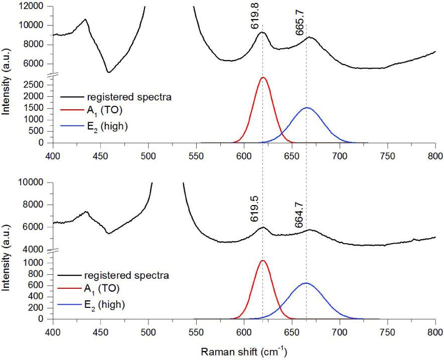 Vibrational spectroscopy studies were used to identify the product of the synthesis. Fig. 4 shows the measured Raman spectra with extracted AlN phonon components. The peak registered at ~520 cm-1 comes from silicon substrate. In both cases, the AlN film synthesized with plasma accelerator in the standard version and the film synthesized using the magnetic filter, we indicated the presence of hexagonal AlN phonon modes, reported in the literature as: nTO (A1) 607 to 614 cm-1, n(2) (E2) 655 to 660 cm-1[24]. AlN peaks in both spectra are almost in the same positions. What is noticeable is that the spectrum of the film deposited in the not filtered process has a slightly lower ratio of AlN peaks signal to fluorescence what may be caused by the existence of metallic fraction in the deposited film (strong fluorescence of metals at visible light).