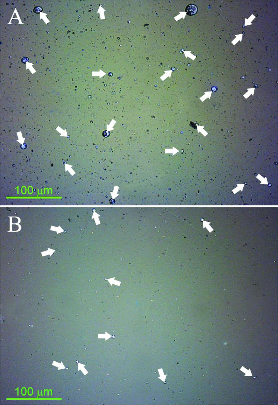 The main aim of our study was to reduce the content of the metallic phase occurring in the form of droplets of aluminum in the structure of AlN films deposited on substrates. Fig. 5 compares the photographs of the film surfaces obtained by using the accelerator in two variants: without the magnetic plasma filter and with the filter. Relatively big metallic macroparticles were indicated by arrows. From a comparison of the images, it is clear that the synthesis system with the filter applied favors obtaining droplets-free films. Our system works as a kind of plasma component separator where the criterion of separation is the mass of the molecules. Light components characterized by molecular dispersion are effectively guided by the filter and delivered to the substrate. A heavy fraction, created during melting the aluminum electrodes by arc discharges and then by the erosion through acceleration of the plasmoids moving towards accelerator outlet, is exported out of range of the filter and is not delivered to the substrate.