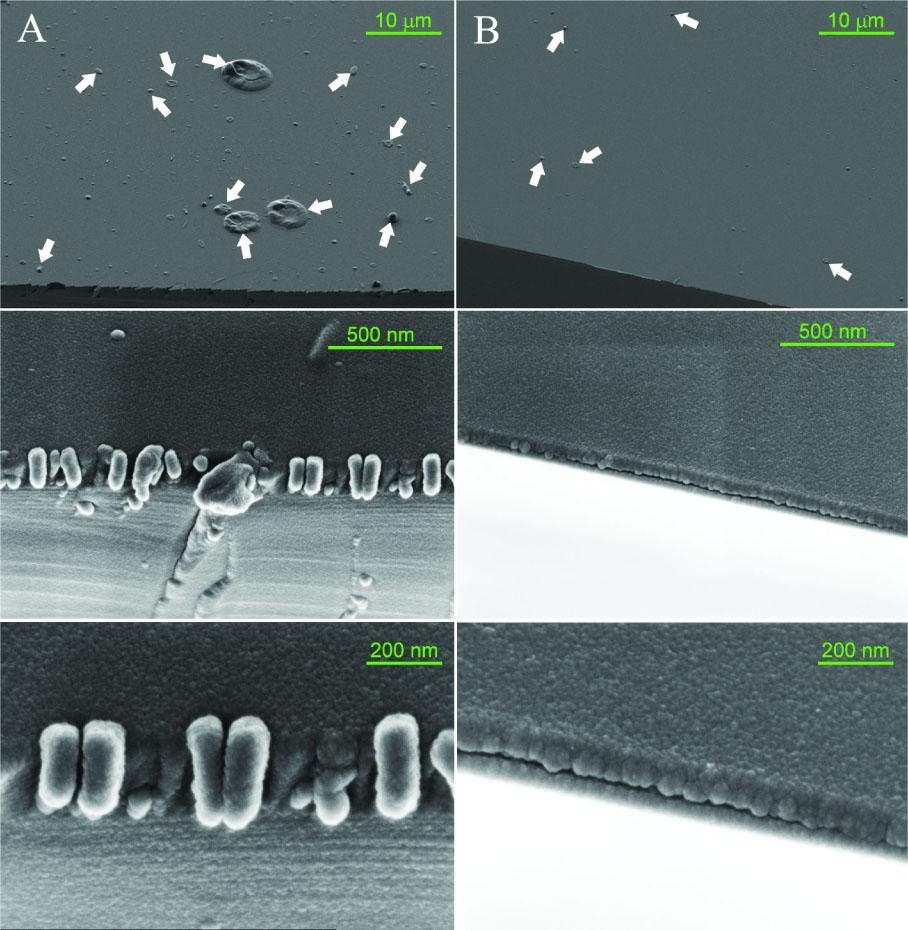 SEM photographs of AlN films structures deposited during the processes with the standard accelerator (left column) and using a plasma filtering (right column).