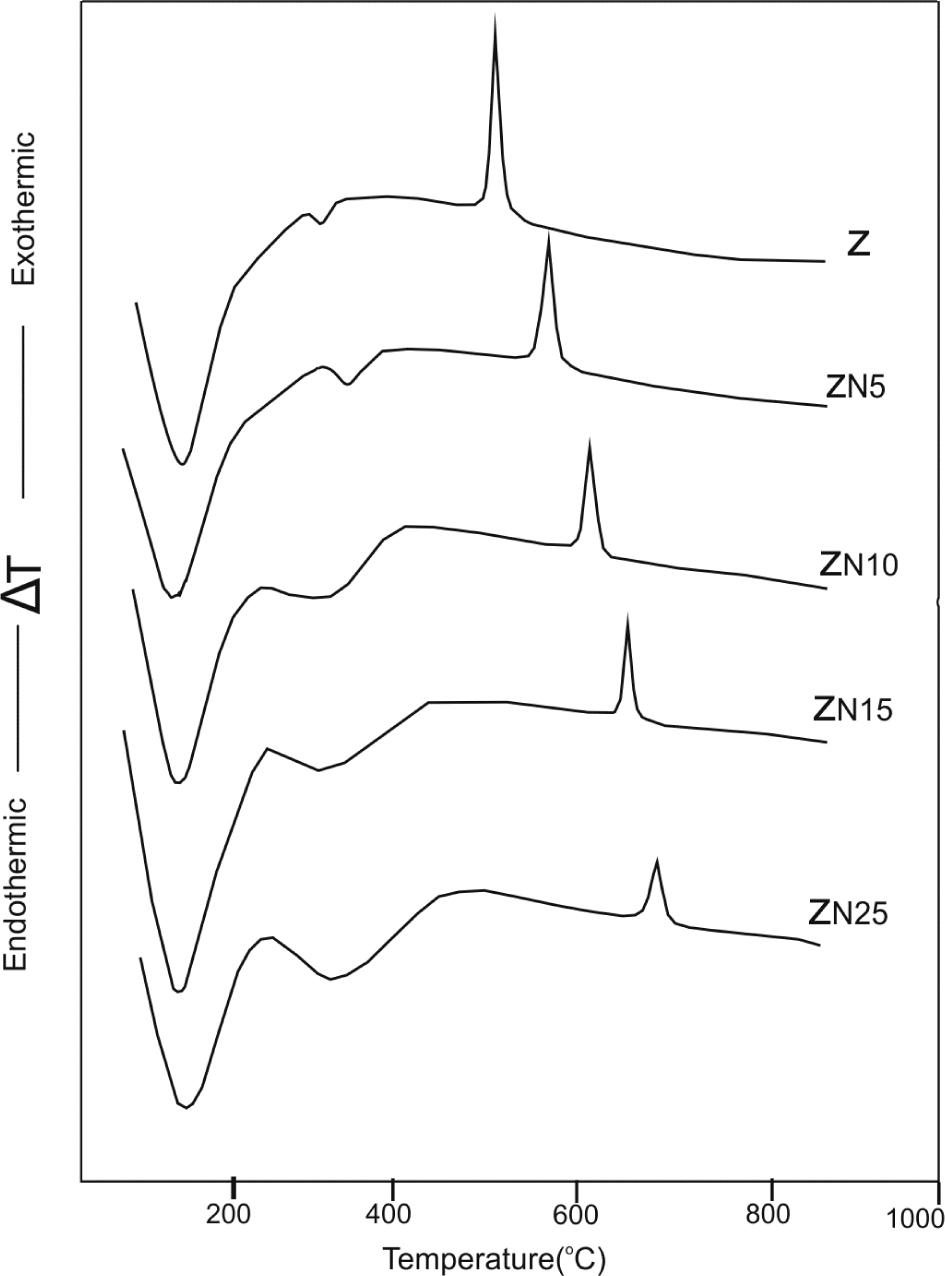 DTA curves of Z, ZN5, ZN10, ZN15 and ZN25 gels.