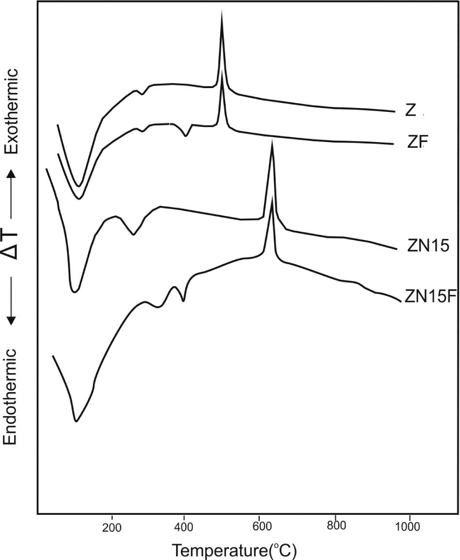 The differential thermograms of ZF and ZN15F samples are shown in Fig. 2. Evidently, ZF and ZN15F samples show an additional endothermic effect at around 400 °C which may be attributed to the decomposition of ammonium salt. Moreover, for one and the same chemical composition the area of the exothermic peak characterizing the crystallization of ZrO2 decreases due to the addition of fluoride ion.