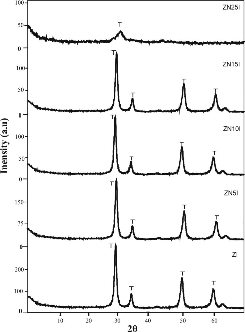 The XRD patterns of NiO–ZrO2 samples calcined at 550 °C and those for Z and ZN15 samples calcined at different temperatures are illustrated in Fig. 3 to Fig. 5. The corresponding phase compositions are presented in Table 1 and Table 2. As seen from Fig. 3 to Fig. 5 the chemical composition and the calcination temperature show significant impact on both crystal phase and crystallite size. The degree of crystallinity of tetragonal phase decreases gradually by increasing NiO content up to 25 wt.% (Fig. 3). It seems that the increase in NiO content to a certain limit is accompanied by crystallite growth and instability of the tetragonal phase. Most published studies agree that incorporation of some additive materials retards crystallization of zirconia, supporting and enhancing its amorphous structure [31, 32]. In fact, the tetragonal phase should be formed above 1170 °C, but in many cases, zirconia obtained by precipitation from aqueous salt solution occurs as a metastable tetragonal phase at lower temperature [33]. Moreover, the transformation of the metastable tetragonal phase into the monoclinic phase is probably due to the lower surface energy of the tetragonal phase compared to the monoclinic phase [34, 35]. Fig. 3 reveals also the absence of diffraction lines characteristic of NiO phase for all NiO–ZrO2 samples calcined at 550 °C. This may be attributed to the high surface area of zirconia support which allowed the high dispersion of NiO species and inhibited the formation of NiO crystallites.