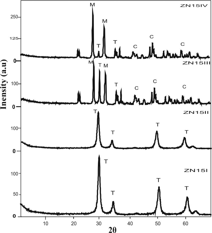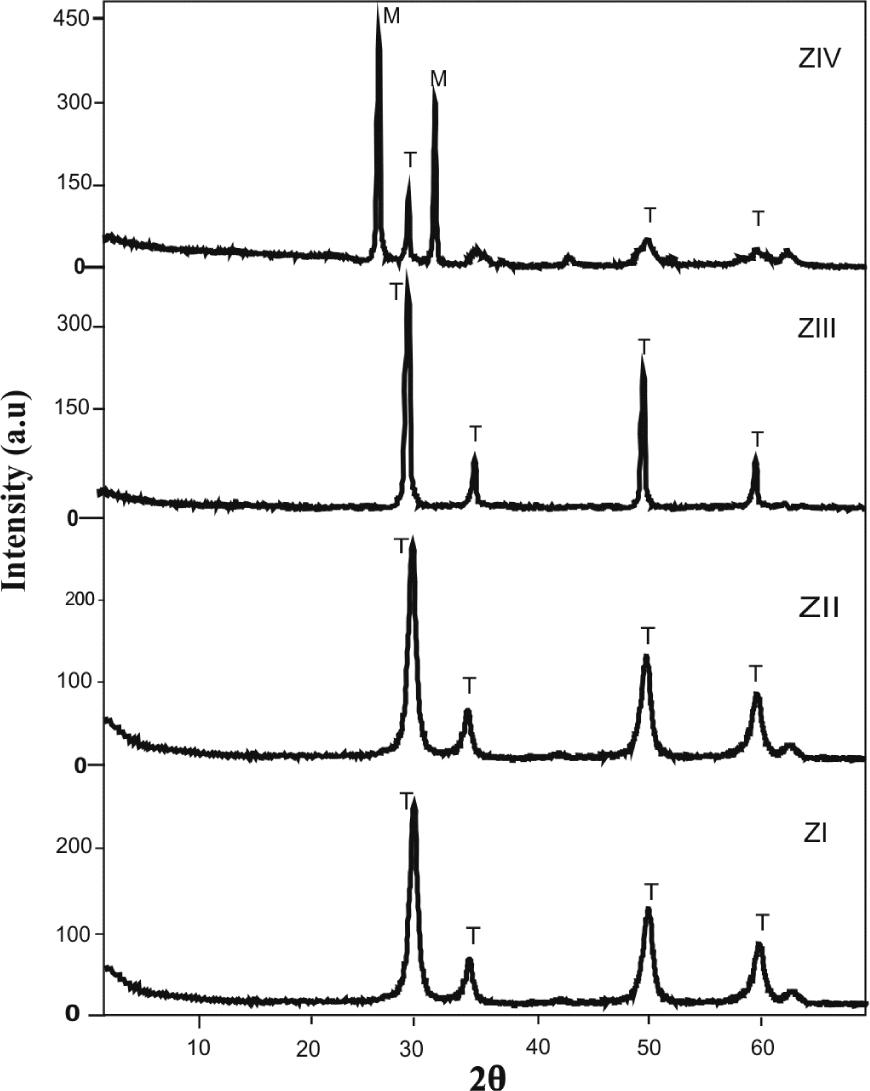 X-ray powder diffraction (XRD) patterns of the calcined samples were recorded using PANalytical, X’Pert PRO diffractometer with nickel filtered CuKα radiation over the 2θ range of 2° to 80°. The crystal sizes of the investigated samples were calculated from XRD line broadening using the Scherrer’s equation [27]. The characteristic peaks at 2θ = 28.2° and 31.5° for (III) and (III) reflexes respectively were assigned to monoclinic phase in ZrO2, while the peak at 2θ = 30.2° for the (III) reflex was assigned to tetragonal phase in ZrO2.