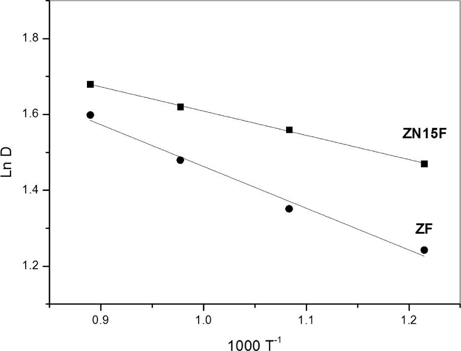 where A is the frequency factor of Arrhenius equation and Es is the activation energy of sintering process of the sample [40]. By plotting ln D versus 1/T, a straight line is obtained whose slope and intercept permit the calculation of Es and A. The Arrhenius plots for undoped and fluoride ion doped Z and ZN15 samples are shown in Fig. 7. The calculated Es values are 13.8 and 24.9 kJ.mol-1 for the Z and ZN15 samples, respectively. These results suggested that pure zirconia responds to sintering faster than NiO supported samples. One can conclude that incorporation of NiO into ZrO2 matrix led to improving its thermal stability. The obtained Es values of the two samples after doping with fluoride ions were found to be 13.21 and 23.16 kJ.mol-1, respectively. It seems that the addition of fluoride ions slightly decreased the thermal stability of the two samples. These results complement also the results obtained from XRD data and confirm that with the increase of calcination temperature, and consequently the increase of crystallite size, was the reason for the pronounced decrease in BET surface area of the calcined samples.
