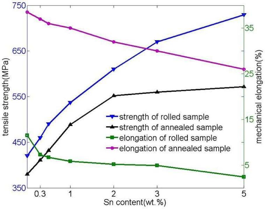 The dependence of mechanical properties of the Cu–5Fe–xSn alloys on Sn content.