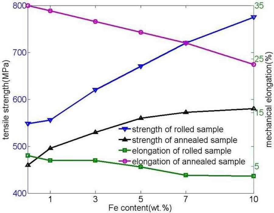 The dependence of mechanical properties of the Cu–3Sn–xFe alloys on Sn content is presented in Fig. 2. It can be seen that the tensile strength of all the rolled Cu–3Sn–xFe alloys exceeds 550 MPa whereas the tensile strength of the cold-rolled Cu–3Sn–10Fe alloy exceeds 770 MPa. It is by 79% more than that of the as-cast Cu–3Sn–10Fe alloy. Study of high-strength and high-conductivity Cu–Sn–Fe alloys Similar to the Cu–5Fe–xSn alloys, the strength of the Cu–3Sn–xFe alloys reduced and the mechanical elongation enhanced obviously due to the annealing treatment.