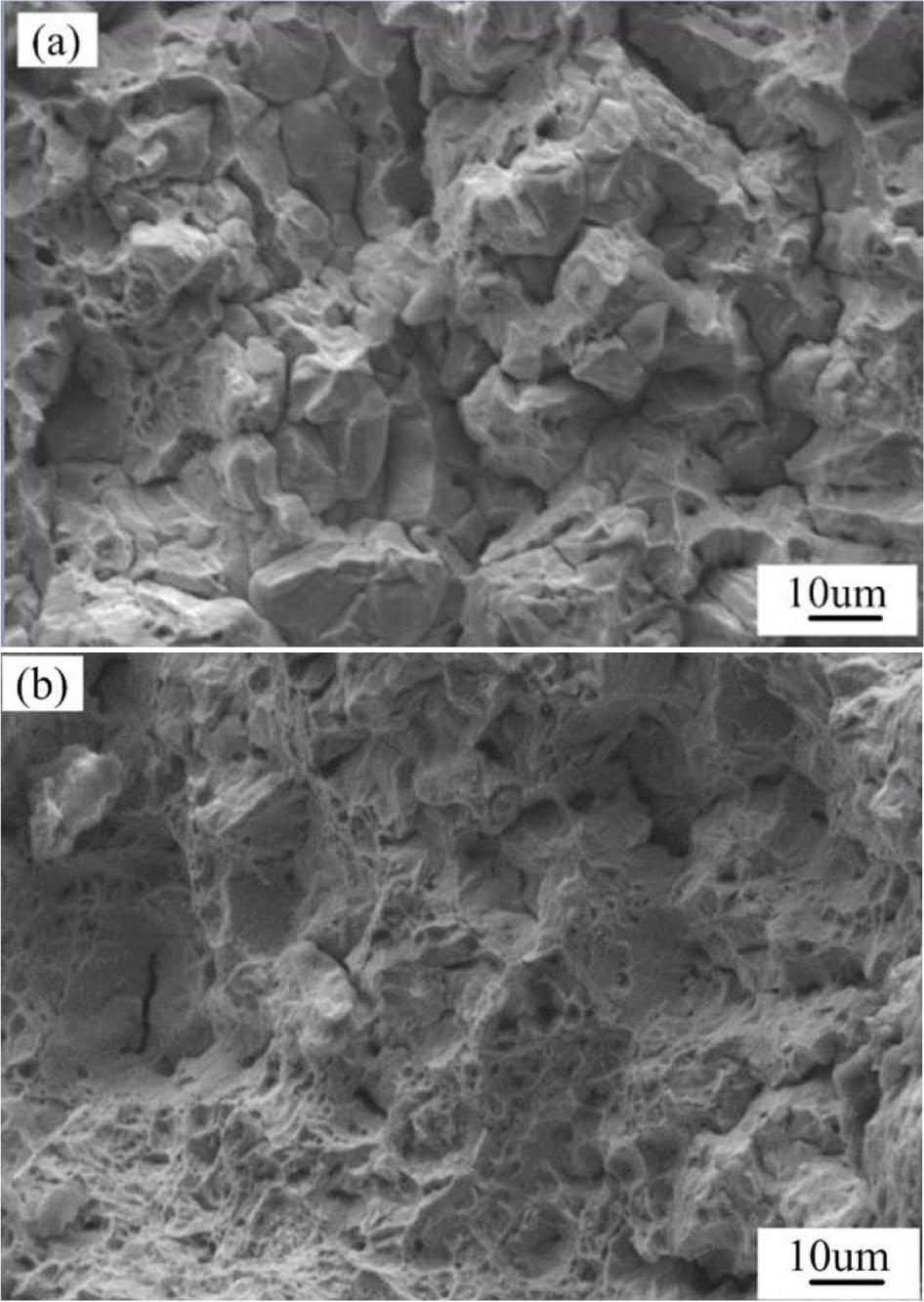SEM images of tension fractures of Cu–2Sn–5Fe alloys: (a) fracture surface of the rolled Cu–2Sn–5Fealloy, (b) fracture surface of the annealed Cu–2Sn–5Fe alloy.