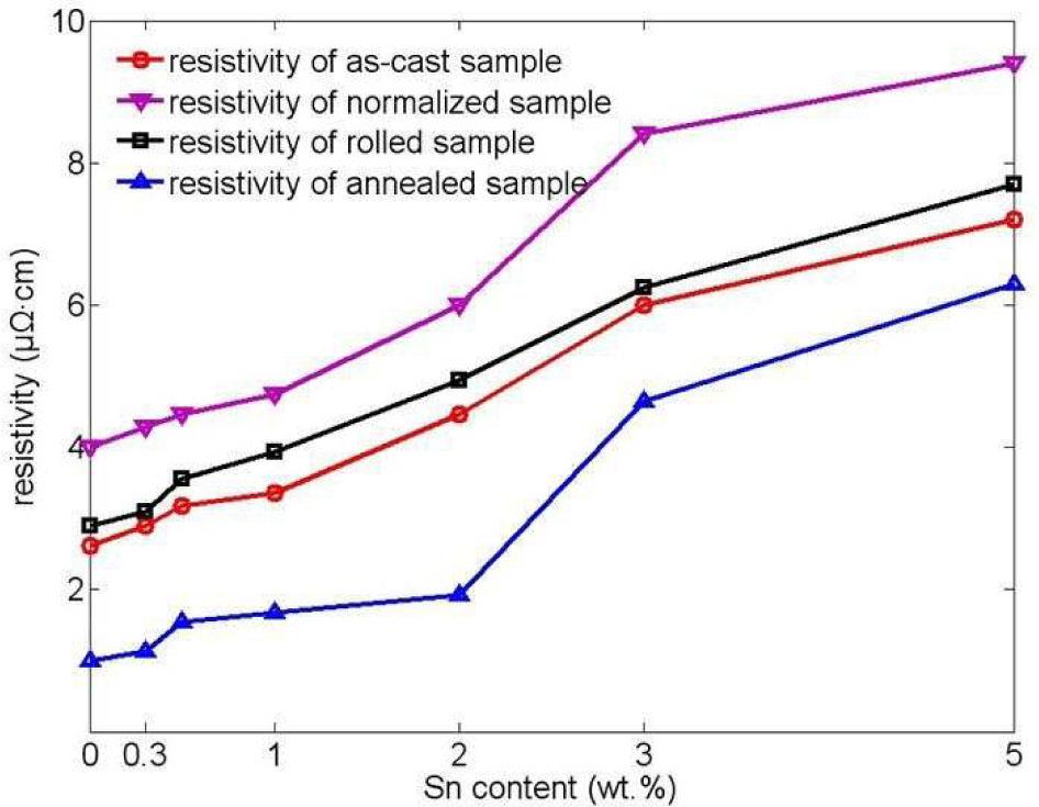 Influence of the Sn content on resistivity of the Cu–5Fe–xSn alloy.