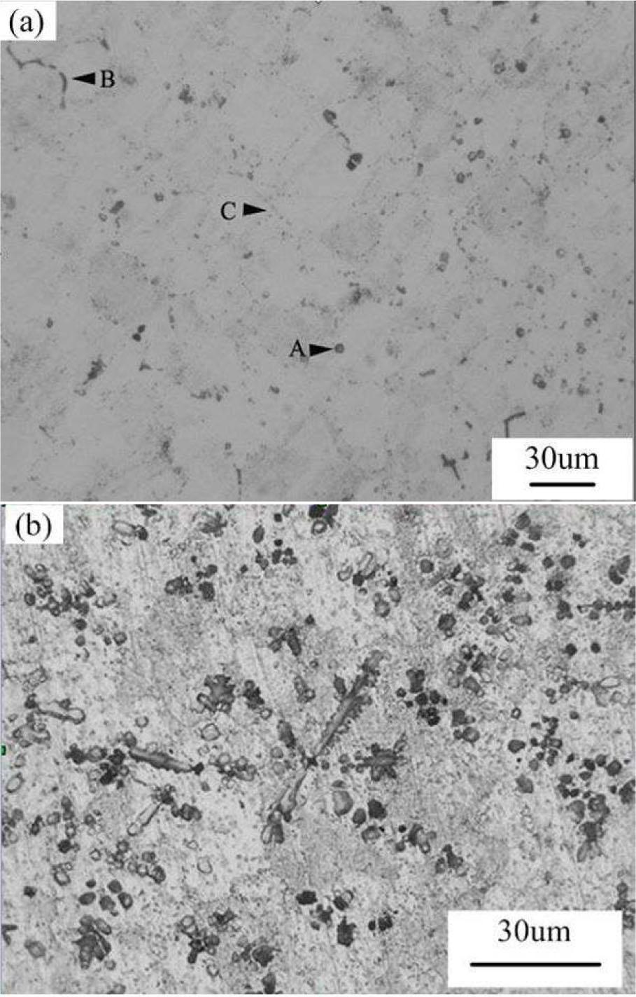 Fig. 6 shows the microstructures of the as-cast Cu–2Sn–5Fe and Cu–3Sn–10Fe alloys. The energy dispersive spectrometer analysis indicated that the substrate consists of Cu-rich solid solution containing Sn and Fe atoms (Fig. 6a). The Cu-rich grains with the size of 10 to 30 μm in diameter have an equiaxed crystal structure. There are no Ferich dendrites in the microstructure of the as-cast Cu–2Sn–5Fe alloy. Just as denoted by the arrow ‘A’ in Fig. 6a, a few primary equiaxed Fe-rich grains with the size of approximately 3 μm diameter exist in the microstructure. A few eutectic microstructures containing Cu, Fe and Sn components, indicated by the arrow ‘B’, can be seen in Fig. 6a. They might be formed in the process of solidification and distributed on the boundaries of Cu-rich grains. In addition, some fine Fe and Sn particles of nanosize, which are denoted by the arrow ‘C’, have precipitated from Cu-rich matrix. As presented in Fig. 6b, the Fe-rich phases with the morphology of dendrite and equiaxed crystal are distributed in the Cu-rich matrix. Due to nucleating in the earlier stage, some Fe-rich grains developed into dendritic structures with secondary dendrite arm spaced of about 2 to 5 μm. Meanwhile, in the microstructure of the ascast Cu–3Sn–10Fe alloy, there appeared also some equiaxed Fe-rich grains with the size of 2 to 5 μm in diameter. In addition, many Fe-rich sediments Study of high-strength and high-conductivity Cu–Sn–Fe alloys of nanosize are dispersed in the Cu-rich matrix, as presented in Fig. 6b. Compared with Fig. 6a, the size and amount of the Fe-rich dendrites are larger in Fig. 6b. Due to the Fe-rich phase with high strength and high resistivity, both the strength and resistivity of the Cu–3Sn–10Fe alloy are higher than those of the Cu–2Sn–5Fe alloy.