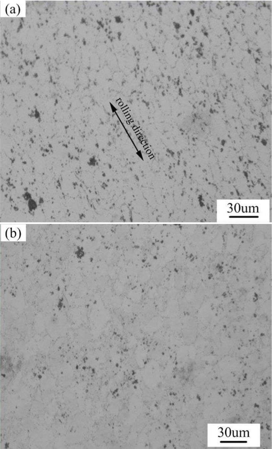 Microstructures of the treated Cu–2Sn–5Fe alloys: (a) the cold-rolled Cu–2Sn–5Fe alloy, (b) the annealed Cu–2Sn–5Fe alloy.