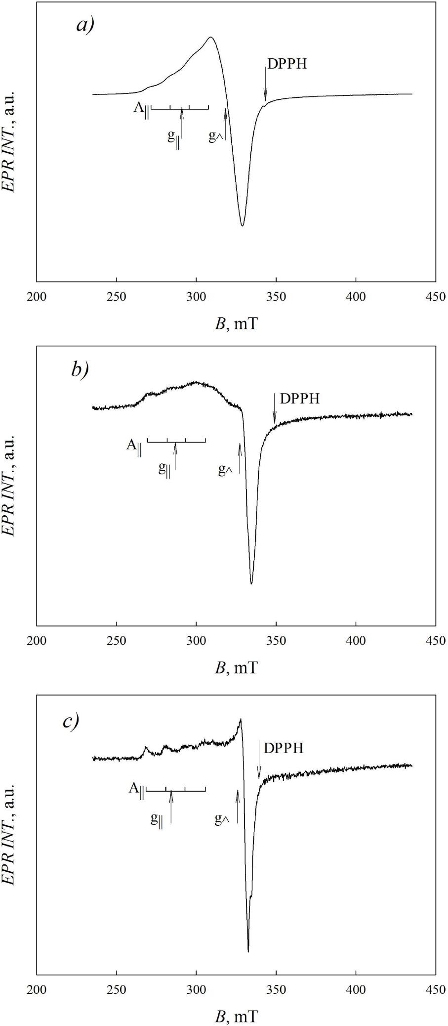 Evaluated parameters obtained from the prominent peaks position in EPR spectra for corresponding Cu+ centers_
