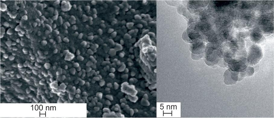 SEM (left) and TEM (right) images of 0.7(Fe2O3)/0.3(ZnO) nanopowder.