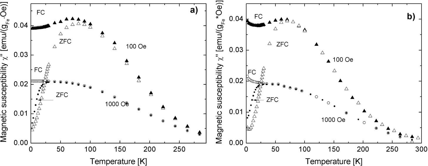 Temperature dependence of the magnetic susceptibility in ZFC and FC modes of 0.7(Fe2O3)/0.3(ZnO) nanopowder (a) and dispersed in polymer 0.7(Fe2O3)/0.3(ZnO) (b) measured in two different magnetic fields (100 Oe and 1000 Oe).
