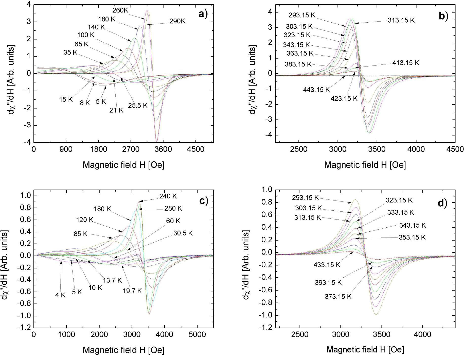FMR spectra of 0.7(Fe2O3)/0.3(ZnO) nanopowder (a, b) and dispersed in polymer 0.7(Fe2O3)/0.3(ZnO) (c, d) recorded at a few different temperatures.