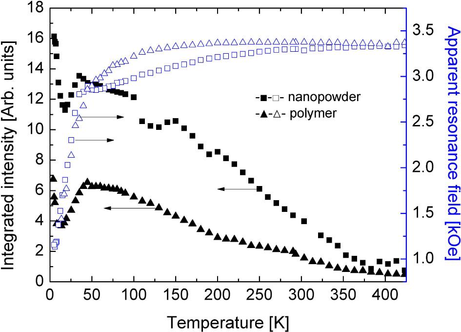 Integrated intensity (left axis) of nanopowder (full squares) and polymer (full triangles) samples, and apparent resonance field (right axis) of nanopowder (open squares) and polymer (open triangles) samples.