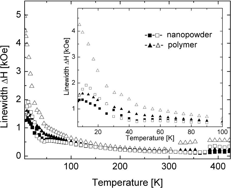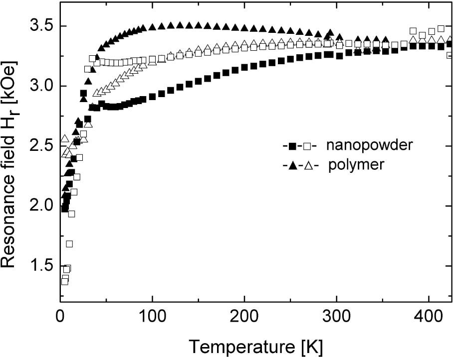 Closer inspection of the temperature dependence of the apparent resonance fields (Fig. 5, right axis) reveals that in the case of polymer sample it increases slightly on cooling from RT down to about 150 K but decreases on further cooling, especially strongly below 50 K. The apparent resonance field is slightly smaller in the nanopowder sample what can be explained by the existence of bigger internal field in that stronger magnetic material. The shift of the resonance field toward lower magnetic field could be explained by the core-shell model [19]. The core is assumed to be in the ferromagnetic (superparamagnetic) state and the surface layer in the paramagnetic state. The nonuniform surface magnetization produces unidirectional field seen by the bulk spins which causes temperature-dependent shift of the FMR line towards lower fields. Strong surface anisotropy results in an increase of the average resonance frequency of the surface spins. Due to exchange interactions, this frequency shift is partly transferred to the bulk spin system, leading to the corresponding shift of the FMR spectrum toward lower fields [19].