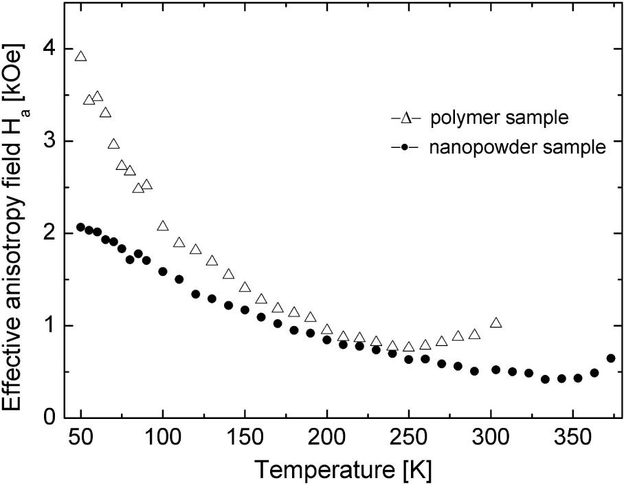 The obtained from equation 3 Ha values as a function of temperature are presented in Fig. 9. In general, the anisotropy field is slightly stronger in the polymer sample and increases with temperature decrease (for T < 250 K and T < 350 K for the polymer and nanopowder samples, respectively) for both studied samples. It is also evident that temperature change of the anisotropy field is more accentuated in the polymer sample and that points to a stronger contribution of the surface anisotropy in that sample caused probably by the surrounding matrix. Similar results were obtained in the investigation of magnetite (Fe3O4) nanoparticles with different sizes [23].