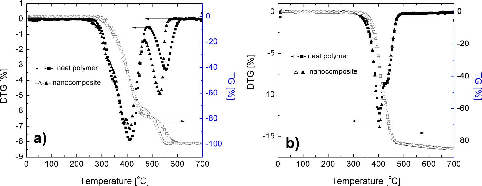 PTMO-based poly(ether-esters) copolymers are sensitive to oxidative degradation due to the ether soft block. It is well known that the mechanism of the thermo-oxidative degradation of these copolymers involves a radical chain process with formation of hydroperoxides at the carbon adjacent to the ether oxygen [24]. The effect of the presence of 0.7(Fe2O3)/0.3(ZnO) in PTT-PTMO matrix on thermal and oxidative stability of the composite was studied by thermogravimetric analysis (TGA). The mass loss (TG) and the DTG (derivative of TG) curves for the nanocomposite and the neat copolymer (without nanofiller) under oxidative (air) and inert (argon) atmosphere are presented in Fig. 10. From the shape of the TG and DTG curves for the nanocomposite and the neat PEN-b-PTMO copolymer, it can be observed that in air and in an inert atmosphere (argon) the thermal behavior of the composite and neat copolymer is very similar. The PEN-PTMO copolymer in oxidative atmosphere has two stages of degradation, which appear in 250 °C to 450 °C and 450 °C to 600 °C ranges. The first step of decomposition is attributed to the decomposition of flexible polyether and rigid polyester segments and the second step is ascribed to the decomposition of the residue [25]. The temperatures at the maximum decomposition rate (maximum on DTG peak) of the main decomposition step in air (at 405 °C) and in argon (at 400 °C) are not induced by the presence of the nanofiller in the copolymer matrix. In air, the first stage of decomposition is slightly influenced by the presence of the nanofiller. The value of temperature corresponding to the 10 % weight loss is shifted to lower temperatures. This indicates that the nanocomposite has lower thermo-oxidative stability than the neat PEN-b-PTMO copolymer. This can be explained by the catalysing of the decomposition reaction by the presence of metal oxide or the increasing of molecular weight polydispersity of the block copolymer in the composite which results in higher concentration of the functional groups (OH, COOH).
