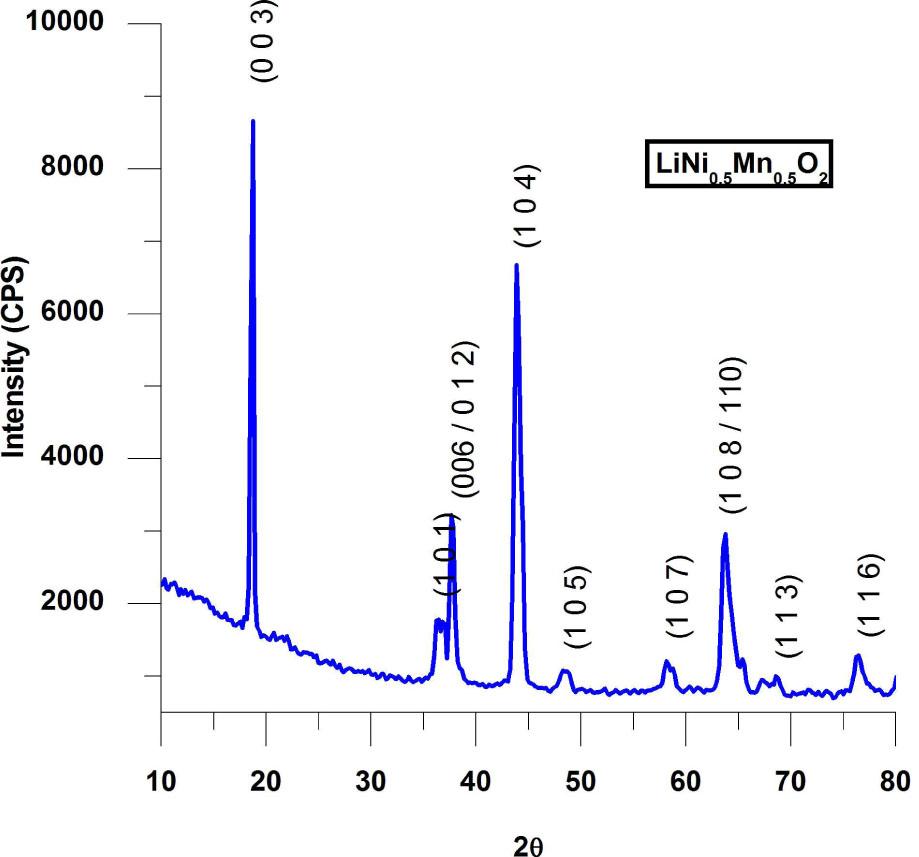 The layered structure cathode materials LiMO2 (M = Co, Ni and Mn) are intensively studied, because of their high energy density, large discharge capacity and low cost [1–3]. In general, cathode materials are characterized by high oxidation potential, long cycle life, good reversibility of reaction, good electronic and ionic conductivity; they are non-soluble in electrolytes and structurally stable for repeated charging/discharging processes [4, 5]. The LiCoO2 has been the most widely used cathode material in commercial lithium ion batteries. However, it causes many problems such as high toxicity, high cost, low practical capacity, etc. [6–8]. Therefore, alternate cathode materials with low cost and non-toxicity have been studied in recent years. LiNiO2 is superior to LiCoO2 due to its low cost and toxicity in high power and large scale energy storage applications, such as mobile phones, laptops and electric tools. So, LiNiO= is a promising alternative to LiCoO2. Studies on cationic substitution, including Fe, Mn, Al, Mg, Co/Al and Co/Mg for Ni are an attempt to stabilize the layered structure of the material [9–15]. In the electronic stabilization approach, Mn is partially substituted by Ni in equal concentration, such as 1:1 in LiNi0.5Mn0.5O2 compound. Ni is found to be at +2 oxidation state and Mn at +4 oxidation state, thus eliminating the adverse effects of John-Teller distortion prone Mn3+ ions. The sol-gel method, solid-state reaction method, co-precipitation method, combustion method and emulsion method have been reported for the synthesis of LiNi0.5Mn0.5O2[16–18]. Among all the methods used for the synthesis of LiNi0.5Mn0.5O2, the sol-gel method has some advantages such as good stoichiometric control, production of sub-micronized particles and lower calcinations temperature.