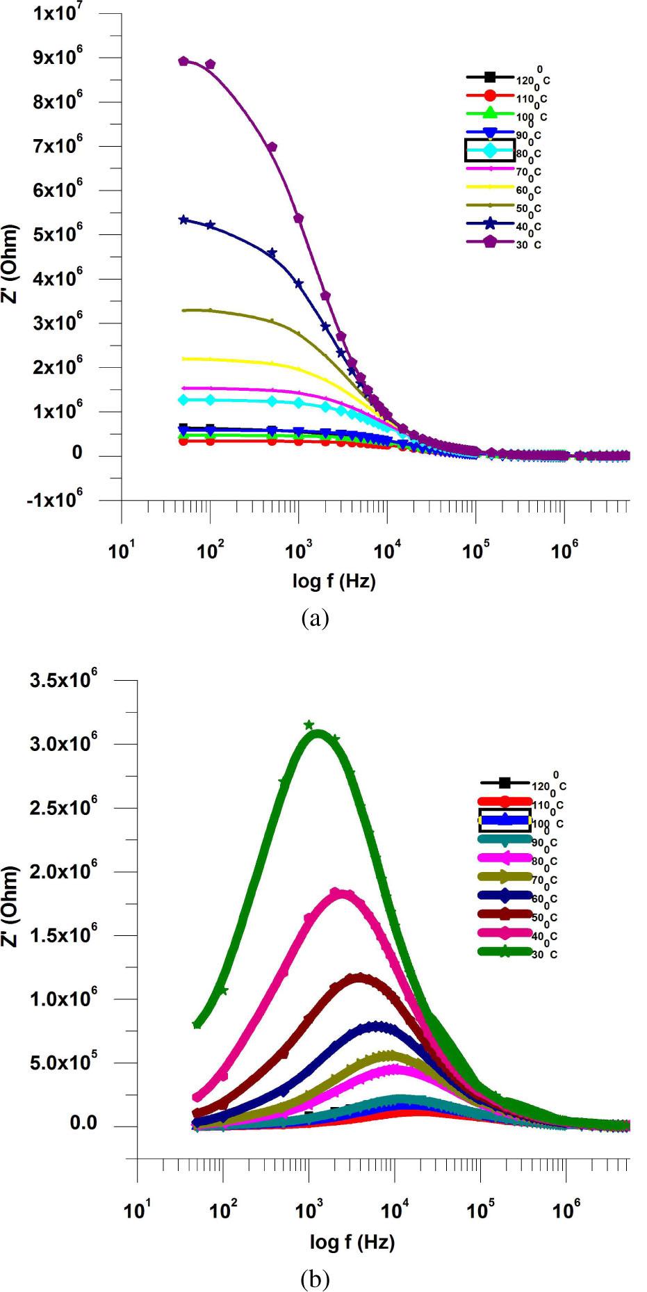 Fig. 5a and Fig. 5b show the variation of real and imaginary parts of impedance Z′ and Z″ of the synthesized sample as a function of frequency at different temperatures. It is observed that the Z′ and Z″ values are typically higher at lower frequency regions for different temperatures. The asymmetric broadening of the peaks with an increase in temperature suggests the presence of electrical process in the material with a distribution of relaxation time. This indicates the temperature dependence of electrical relaxation phenomena in the materials [41]. The high value of Z′ and Z″ at lower frequency regions is due to the higher polarization caused by space charge. It is also observed that the values of Z′ and Z″ gradually decrease with increasing frequency and temperature. This indicates an increase in AC conductivity with the rise in temperature and frequency. Here, at low frequency, the value of Z’ decreases with the rise in temperature showing negative temperature coefficient of resistance (NTCR) type behavior, similar to semiconductors [42].