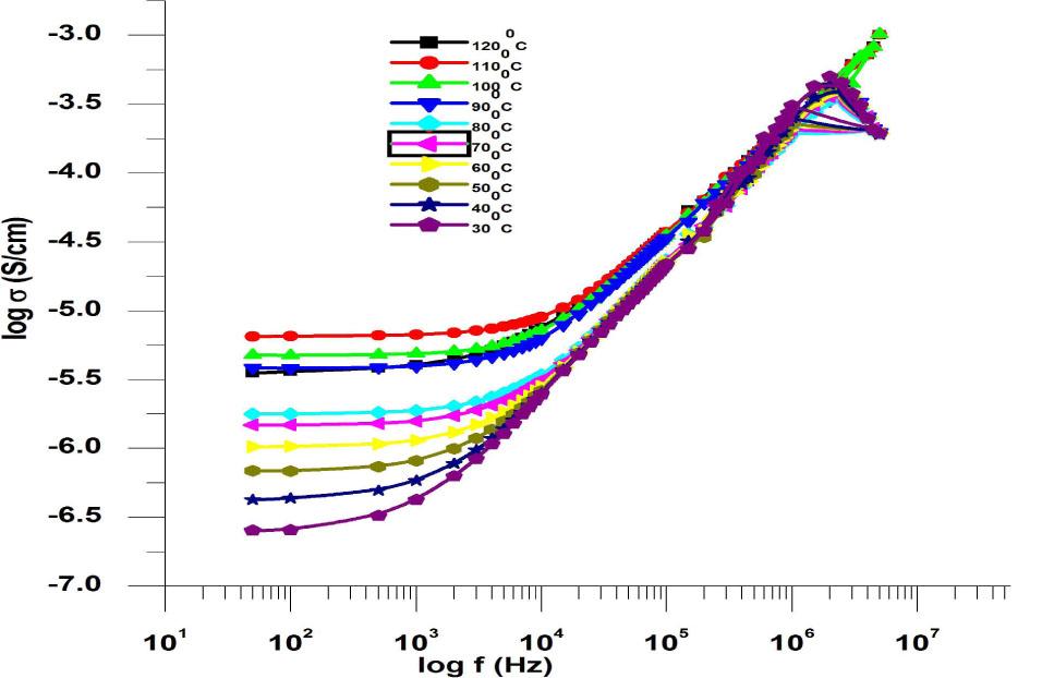 Fig. 6 shows the variation of AC conductivity of the synthesized material as a function of frequency at different temperatures (30 °C to 120 °C). At low frequency, AC conductivity exhibits dispersion and increases with an increase in frequency and temperature [43]. The maximum AC conductivity of the synthesized sample is 1.03 × 10−6 S/cm at 60 °C.