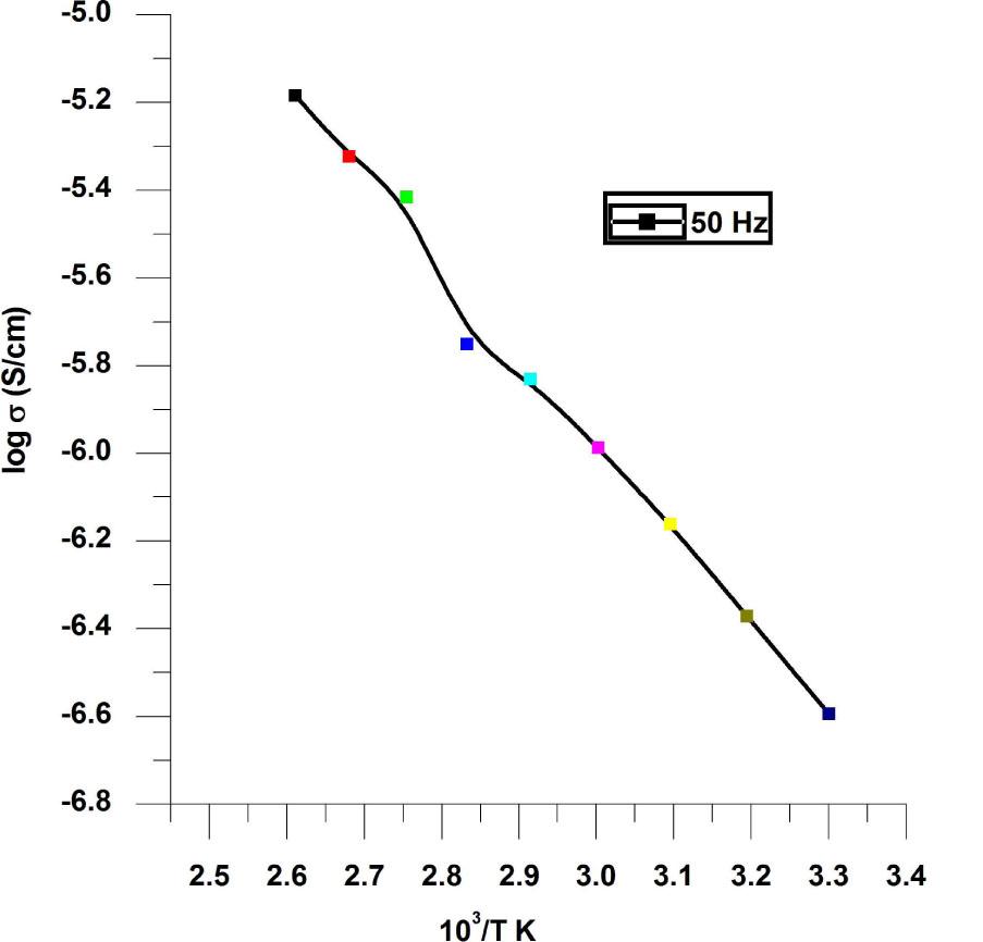 The activation energies for AC conductivity at different temperature regions were obtained by measuring the slope of the curves and using the Arrhenius relationship: