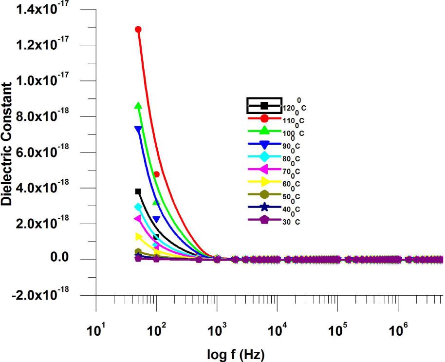 From Fig. 8 it is observed that the dielectric constant (∊′) decreases with increasing temperature, moreover, it rises sharply towards low frequencies and the shape of the rise is changing as the temperature increases. The increment of dielectric constant (∊′) is rapid at lower temperatures and shows almost frequency independent behavior at higher temperature. At lower frequency regions, the dipoles get sufficient time to orient themselves completely along with the direction of the field, resulting in larger values of ∊′ of the sample [46].