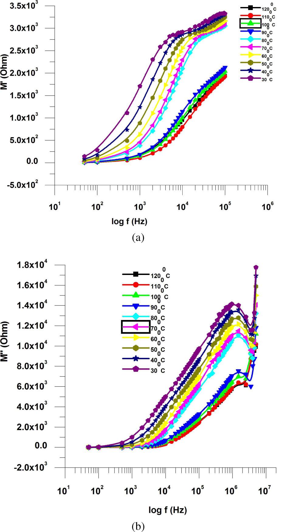 Fig. 9a shows that M′ values tend to a constant value at higher frequencies, whereas M″ has a peak centered at the dispersion point of M′. It is also clear from Fig. 9b that the value of M″ decreases and shifts toward higher frequencies as temperature increases. The variation of M′ and M″ as a function of frequency shows shifting of the peaks towards the high frequency as temperature increases, which implies that there is a distribution of ionic relaxation time. The shift in frequency of the M″ peak corresponds to the conductivity relaxation phenomenon [49].