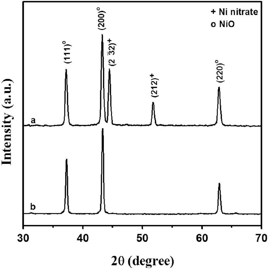 XRD patterns of NiO nanoparticles (a) as prepared and (b) calcined at 600 °C.