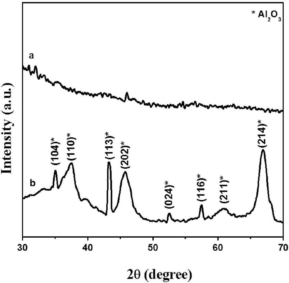 On the other hand, the as-obtained Al2O3 is amorphous (Fig. 2a). It needs high calcination temperature to obtain crystalline α-Al2O3 particles. Therefore, the as-obtained powder was calcined at 1200 °C for 2 h. Its XRD pattern (Fig. 2b) shows broad peaks indicating presence of small size particles (~34 nm). The α-Al2O3 nanoparticles have crystallized into the rhombohedral structure with lattice parameters; a = b = 4.76 Å and c = 12.76 Å. The elemental analysis of the calcined powders also showed the peaks due to either Ni and oxygen or Al and oxygen. No impurities were detected. The analysis data are tabulated in Table 2.