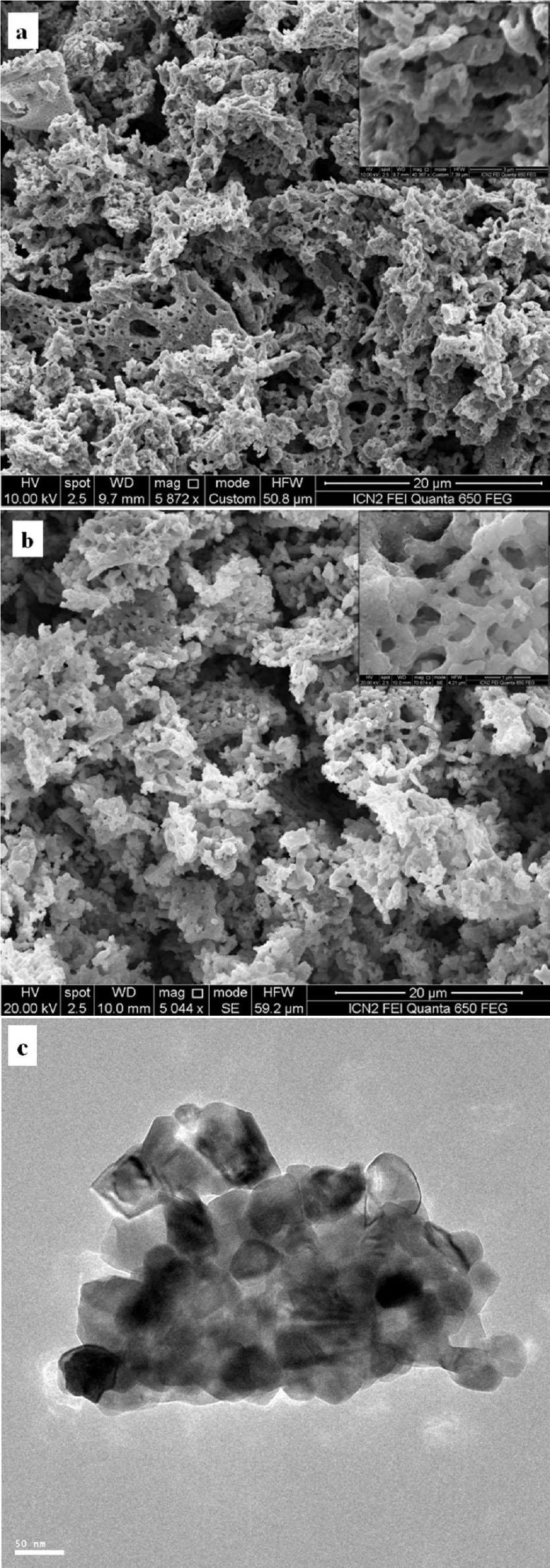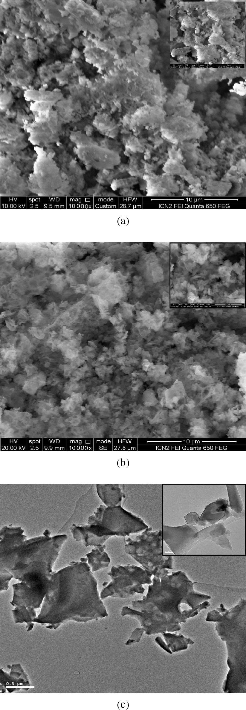 The morphology of the as-obtained (Fig. 3a) and calcined (Fig. 3b) NiO powder shows almost the same features and is foam-like with highly porous structure. The porosity has little decreased after calcination. The insets in the figures reveal roughly spherical grains. The TEM image of NiO nanoparticles (Fig. 3c) shows the nearly spherical particles, 30 nm in size. The SEM images of the as-obtained and calcined Al2O3 nanoparticles are shown in Fig. 4a and 4b. The amorphous-like structure without well-defined particle shapes is observable from SEM image of as-obtained Al2O3 (Fig. 4a). The amorphous powder is constituted of micrograins with a large size distribution. After calcination, the grain growth occurs and highly silky soft powder is seen in the SEM image (Fig. 4b). The higher magnified image of α-Al2O3 is shown in the inset of Fig. 4b. It reveals the platelet morphology of α-Al2O3. The TEM of Al2O3 (Fig. 4c) shows a mixture of different kinds of particles: platelets, spherical and needles but most crystallites exhibit hexagonal platelet morphology as shown in the inset of Fig. 4c. The average size of the platelet is 70 nm.