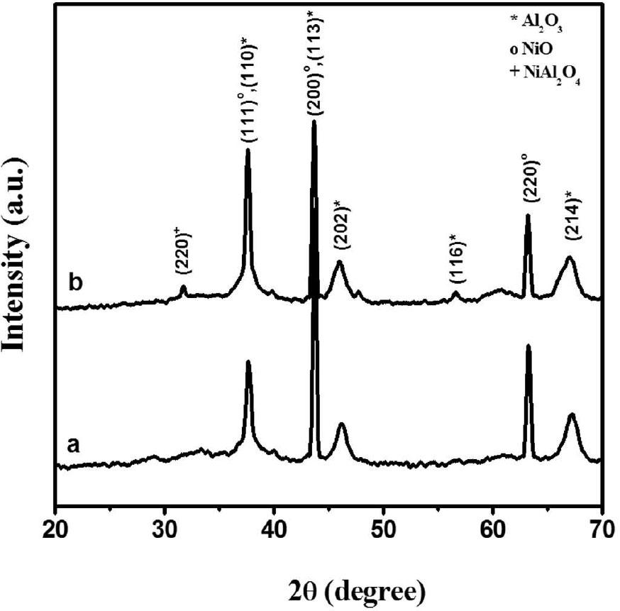 On the contrary, Wang et al. [22] observed that Ni loading up to 20 wt.% was soluble in Al2O3 forming spinel NiAl2O4, and NiO loading above 20 % formed Ni–Al2O3. This shows that NiO species reacted with the Al2O3 to form a spinel NiAl2O4 phase. Moreover, Hao et al. [23] reported that the NiO phase started to appear in Ni–Al2O3 prepared by an aerogel method at nickel contents exceeding about 20 wt.%. These results indicate that the degree of reaction between nickel and the Al2O3 in the Ni–Al2O3 catalysts is dependent on the preparation method.
