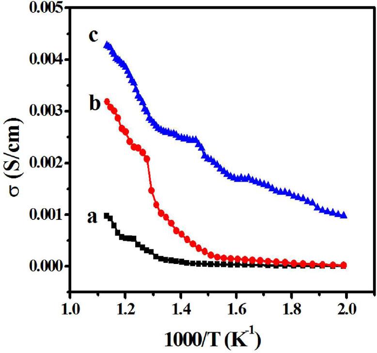 DC conductivity of NiO–Al2O3 in (a) air, (b) iogas and (c) hydrogen atmosphere.