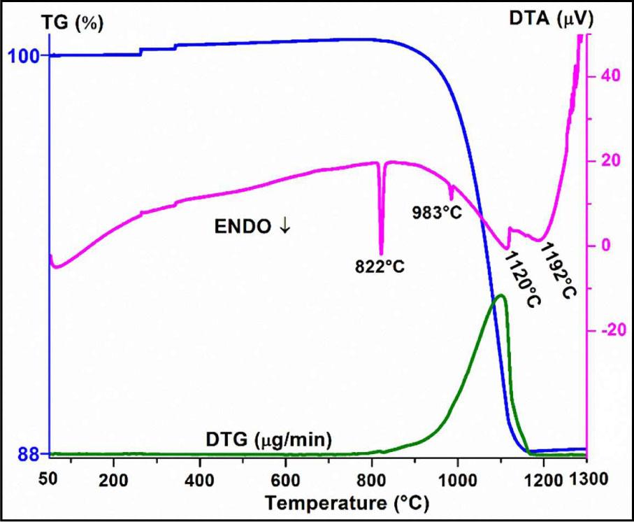 It can be clearly seen from the DTA/TG curves that BaCO3 posses three crystallographic structures that are rhombohedral (natural witherite), β-hexagonal and α-cubic forms, depending on the temperature. The phase transformations in BaCO3 agree with previous studies, including our works. Thus, the first two endothermic peaks are attributed to the orthorhombic to rhombohedral transition at 822 °C and a rhombohedral to cubic phase transition at 983 °C [5].