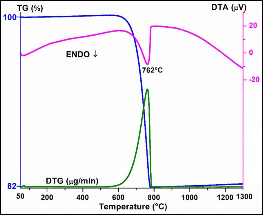 The TG curve demonstrates a major weight loss between 600 °C and 900 °C which is due to the decomposition of CaCO3 and the elimination of CO2 in the system (Fig. 1). The decomposition reaction during the heating is as follows: