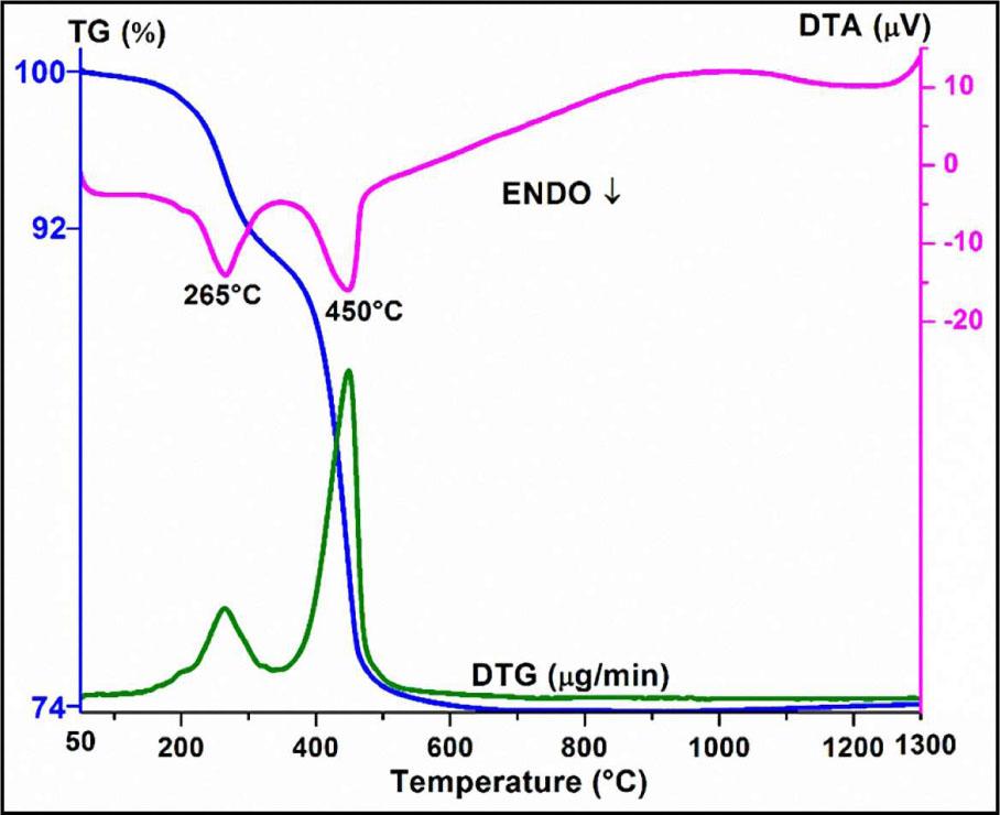 The first endothermic peak associated with mass loss (TG) occurs at 265 °C which is related to the departure of the hydroxyl group from Mg(OH)2. The second endothermic peak with a greater decrease in mass (TG) at 450 °C proves the decomposition of MgCO3 changing into MgO [2, 8]. The TG curve exhibits a total mass loss of about ~25.5 %, which is very similar to the calculated mass loss (~27.0 %) after the decompositions of the sample were completed.