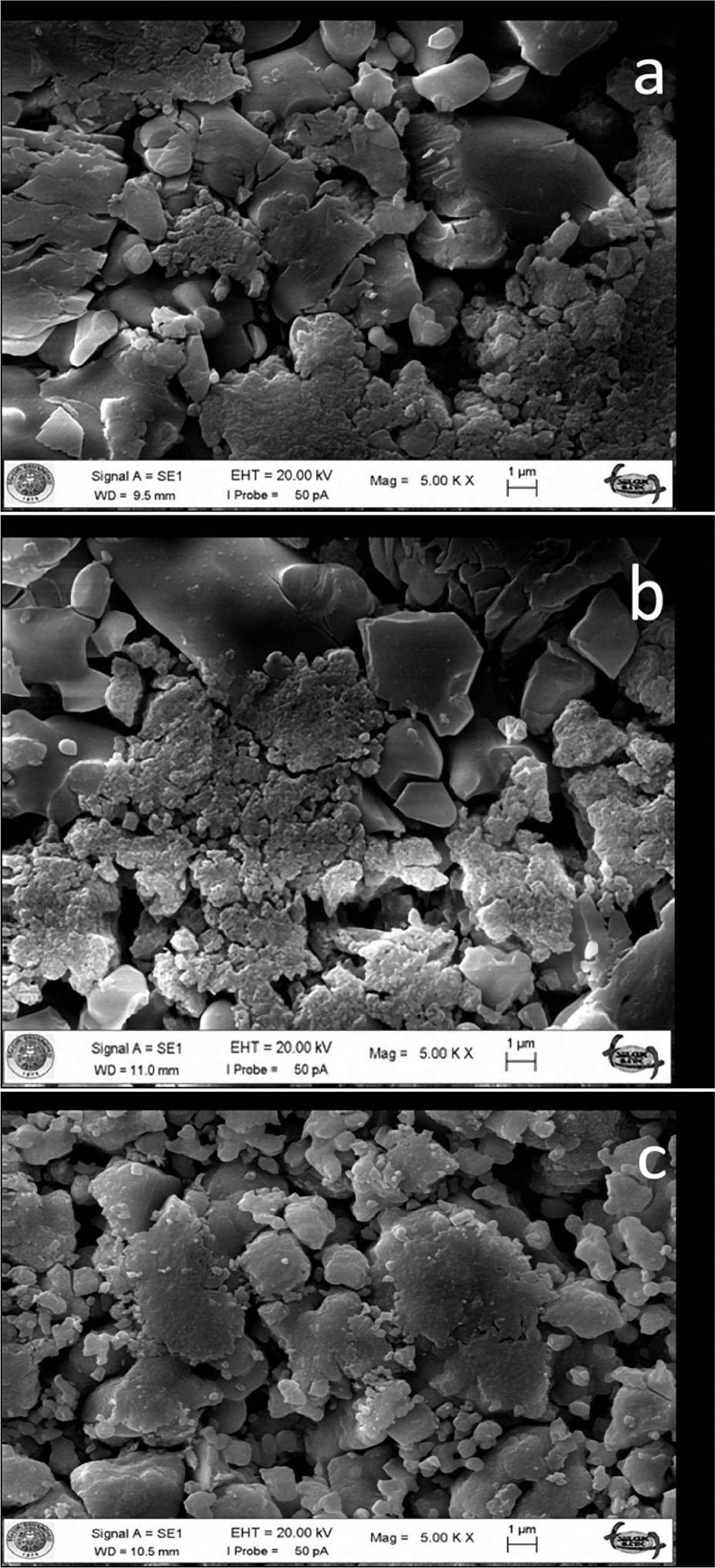 SEM images for (a) Ba3Al8O15:Eu3+,Dy3+, (b)Ca3Al8O15:Eu3+,Dy3+ and (c) Mg3Al8O15:Eu3+,Dy3+.