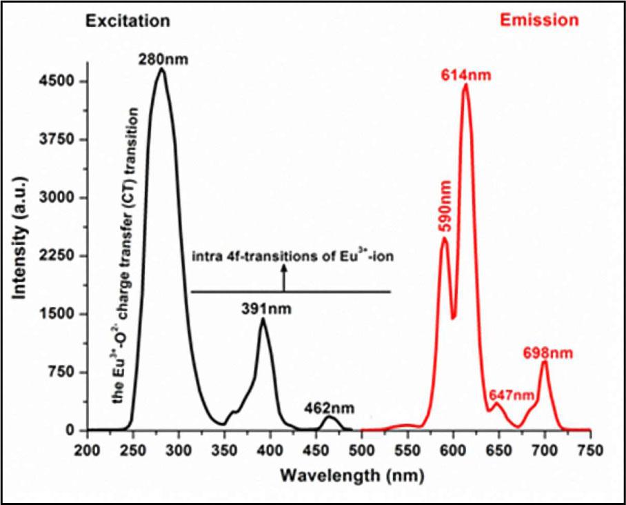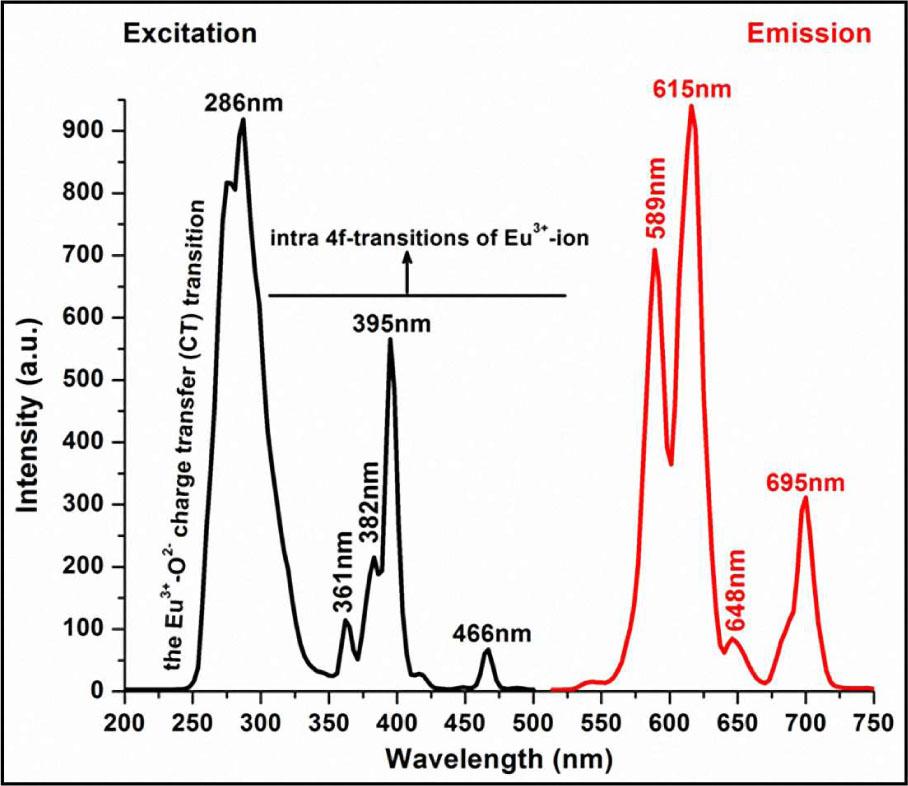 In this research, the PL results of all the samples are both important and striking, despite the XRD results. The PL analyses of the three samples show maximum emission bands at around 610 nm, and additionally near 589 nm, 648 nm and 695 nm, which can be attributed to typical 5D0 → 7F2, 5D0 → 7F1, 5D0 → 7F3, 5D0 → 7F4 transitions of the Eu3+ ion, respectively. The most intense and broad band near 286 nm is the charge-transfer state (CTS) band which proves that the typical Eu3+-activated phosphors mostly show strong CTS transition band excitation around 200 nm to 300 nm. Furthermore, the CTS is related to the electron transferred from the oxygen 2p orbital to the empty 4f orbital of europium, which may be ascribed as ligand-to-Eu3+ charge-transfer transitions (LMCT). The other bands between 300 nm to 500 nm originate from intra-4f forbidden transitions of Eu3+, such as the band at 395 nm, which is associated with the 7F0-5L6 transition [2, 9, 10]. Typical emission bands of Dy3+ ions have not been observed in the PL spectrum of all the phosphor systems.