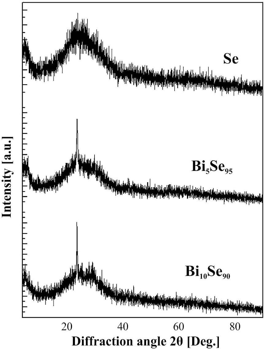 Structure and surface morphology of BixSe1-x thin films were studied by X-ray diffraction XRD and atomic force microscopy. XRD patterns in Fig. 1 show the amorphous nature of Se, but due to addition of Bi there is a diffraction peak at 2θ = 23.49° for Bi5Se95 and at 2θ = 23.48° for Bi10Se90. There is also a small diffraction peak at 2θ = 29.26° for Bi10Se90 film due to some crystal features of the film. By fitting the relative intensities and the peak positions in the XRD patterns, it was found that the diffraction peak at 2θ = 23.48° is due to Bi atoms (PDF card file No. 69-901-1997) and the peak at 2θ = 29.26° for the Bi10Se90 film is due to the presence of Bi2Se3 clusters (PDF card file No. 69-901-1966). Formation of these clusters resulted in a rough surface which was confirmed by AFM measurements as shown in Fig. 2. The film surface of Bi5Se95 is smooth with RMS roughness of 0.0124 nm but for Bi10Se90 the RMS roughness increased to about 3.93 nm confirming the formation of Bi2Se3 clusters which show strong n-type conduction [7].