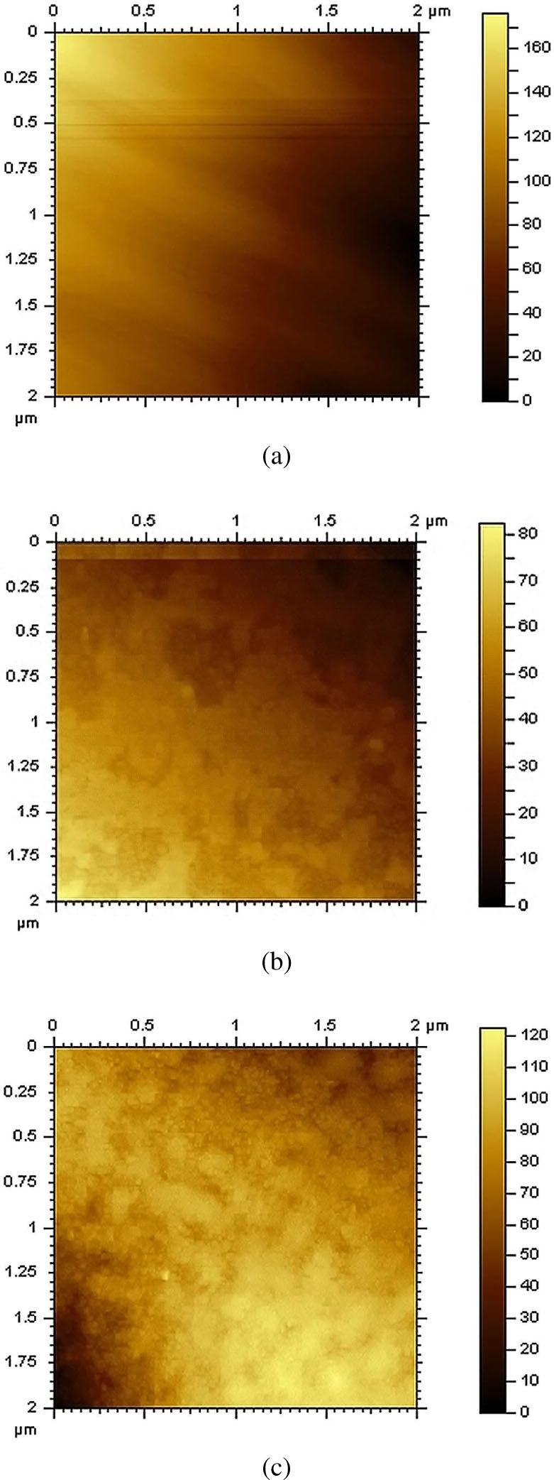 Bulk glassy BixSe1−x alloys with x = (0, 5 and 10) were prepared from high purity, (5N), Se and Bi by the well-known melt quenching technique. The successful method for obtaining thin films with homogenous composition and thickness from the melt quenched ingot was the thermal evaporation technique under vacuum of 1 × 10−4 Pa, with the substrate heated to about 150 °C. The film thickness was monitored during the deposition process using a quartz crystal thickness monitor (Edward FTM5), and it was in the range of 1800 Å to 2000 Å. Elemental analysis of the prepared films was performed using energy dispersive X-ray, EDX spectrometer attached to a Joel JSM-5410 scanning electron microscope. EDX analysis results were obtained for three randomly selected areas to confirm compositional homogeneity (Table 1). Structure of thin films was evaluated by a Shimadzu X-ray diffractometer, model XD-D1 with CuK α radiation target, λ = 1.5418 Å, operated at 40 kV and 30 mA in a wide range of Bragg’s angles (2θ = 5° to 90°). Film morphology was studied using an atomic force microscope, AFM, Agilent type, AFM 5500, USA. AFM is a powerful tool to obtain high resolution maps of surface potential distribution on conducting and non-conducting samples. Contact potential difference better than 0.1 mV and the lateral dimension (≤50 nm) were obtained for the samples under investigation. A conventional hot-probe experiment was used to distinguish between n-type and p-type semiconductors using a hot probe and a standard multimeter. Positive voltage read out was obtained for n-type semiconductor whereas for a p-type semiconductor, negative voltage was measured. Thin film samples were deposited on glass substrates in a co-plannar configuration, with Au electrode separated by ~0.15 cm gap for DC conductivity measurements. The measurements were carried out under controlled equilibrium conditions in the temperature range of 209 K to 313 K (glass transition temperature Tg~326 K). Keithly 617 digital electrometer as well as a power supply and temperature controller were used in a special setup for conductivity measurements. Optical absorption was recorded using a double-beam Shimadzu 160A UV-Vis spectrophotometer in the wavelength range of 200 nm to 1100 nm, with normal incidence at room temperature. Effect of γ-irradiation was studied for the films of a thickness of 400 nm with the doses up to 51 kGy in a Co60 source of γ-radiation type 400 A (India) at a dose rate of 5 kGy/h.